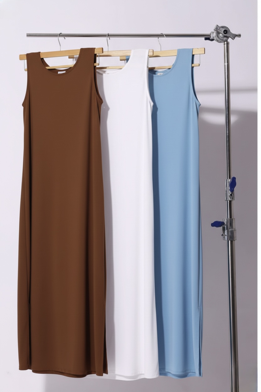 This sleeveless inner is made from luxurious Korean satin, known for its smooth texture and elegant fall. The fabric feels soft against the skin, offers a subtle sheen, and gives a polished finish under sheer or open abayas.
